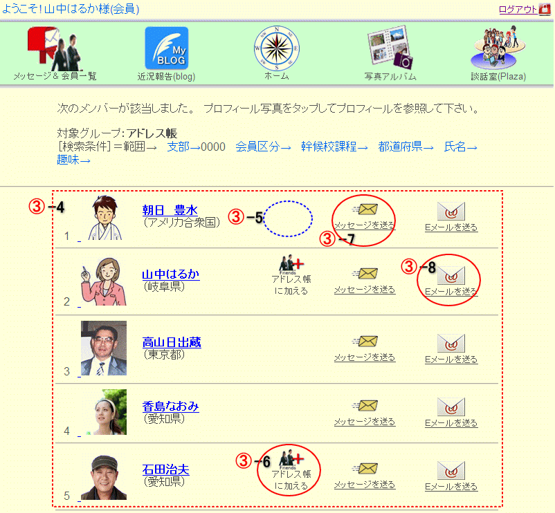 会員一覧は、プロフィール写真と表示され解り易くなっています。一覧表からは、「公開プロフィール明細」「アドレス帳」への登録、「メッセージの送信」「Eメールの送信」等の宛先に利用します。