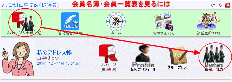 メインメニューの「メッセージ&会員一覧」をクリックすると、2段目のサブメニューに「 会員一覧」のアイコンをクリックします。