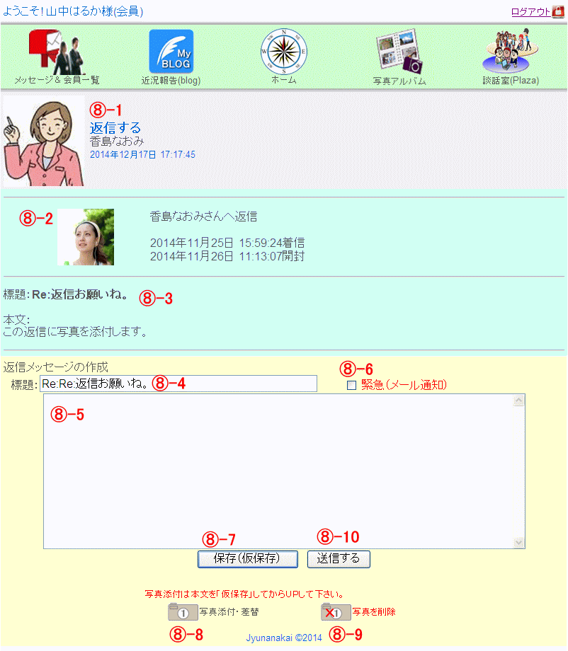 メッセージに対する返信の手順を説明します。 返信は何回でも、受信者も送信者も出来ます。 従って交互にやり取りをすることでチャットの様な使い方も出来ます。
