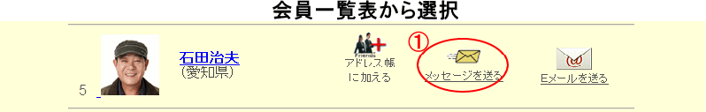 いずれの画面からでも「会員プロフィール写真」をクリックするとその会員のプロフィールが表示され、そのサブメニューの「●●さんにメッセージを送る」のアイコンをクリックすると、宛先に「●●さん」を指定してメッセージの記入画面が表示されます。