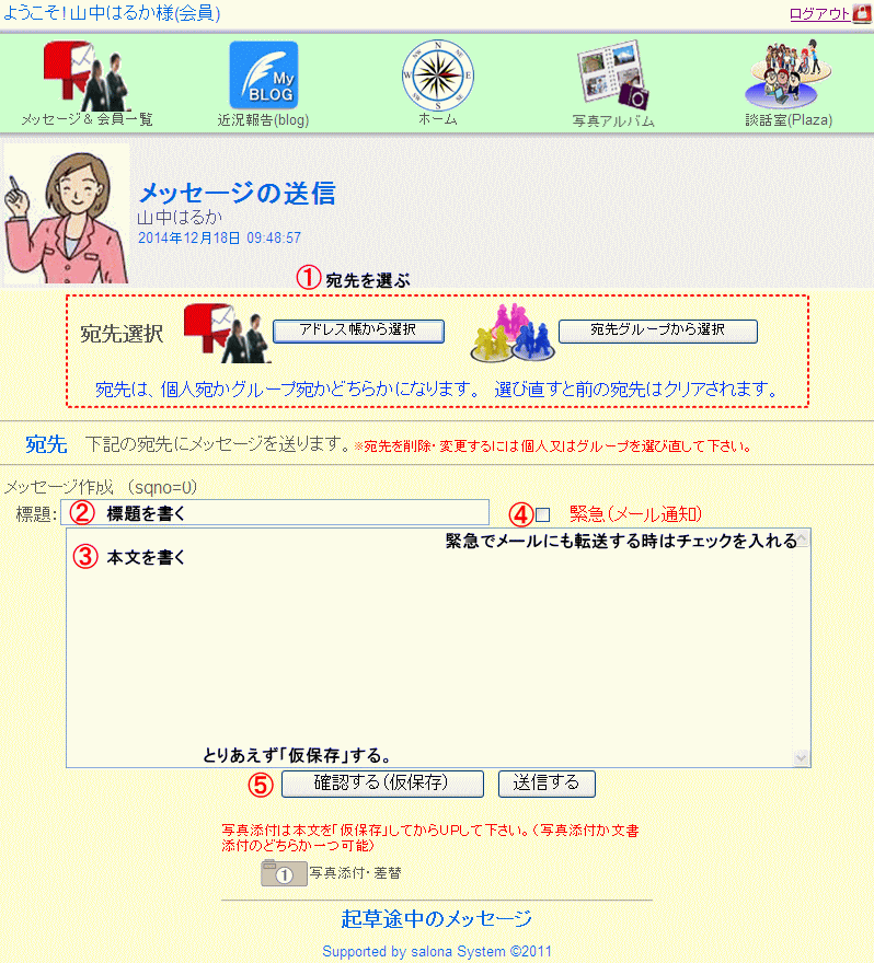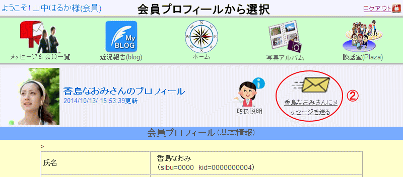 【メッセージ&会員一覧】→【メッセージを見る】→【メッセージを書く】