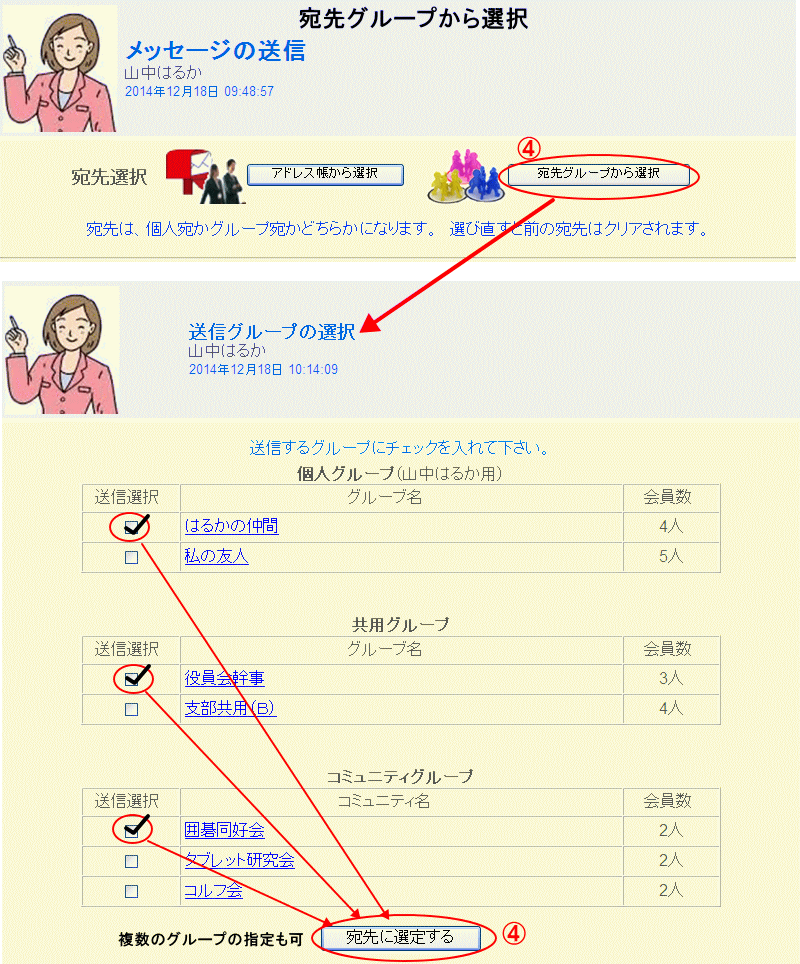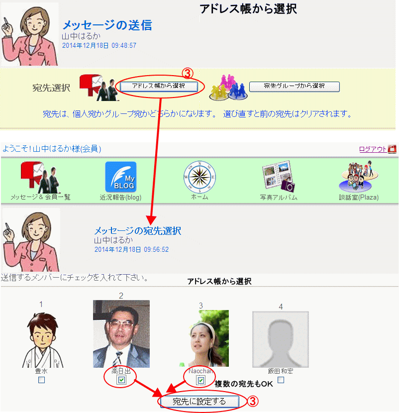 メッセージ記入の画面の宛先選択で「アドレス帳から選ぶ」をクリックすると自分のアドレス帳が表示され、表示された会員のプロフィール写真の下にチェックボックスがあるので、メッセージを送りたい相手のチェックボックスにチェックを入れ、「宛先に設定する」を押すと、チェックした会員があて先として取込まれメッセージ記入画面に戻ります。
