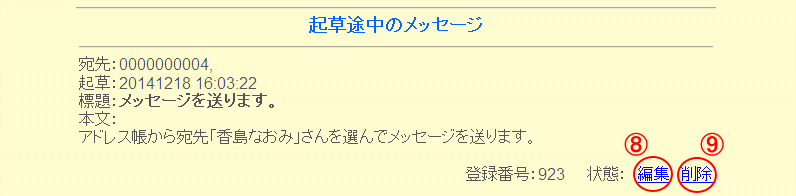 メッセージを起草途中で「仮保存」のままで他の画面や作業を行った場合、「メッセージを書く」の画面を出すと、その最下欄に今までの起草途中になっているメッセージの一覧表が表示されます。
