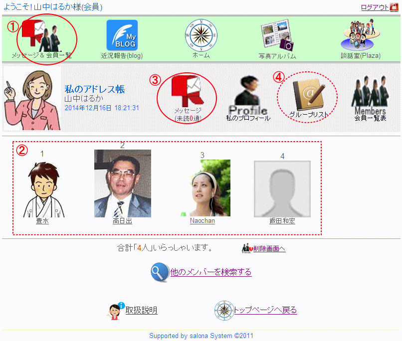 「私のアドレス帳」が表示され、アドレス帳に登録している会員がプロフィール写真で表示されます。
