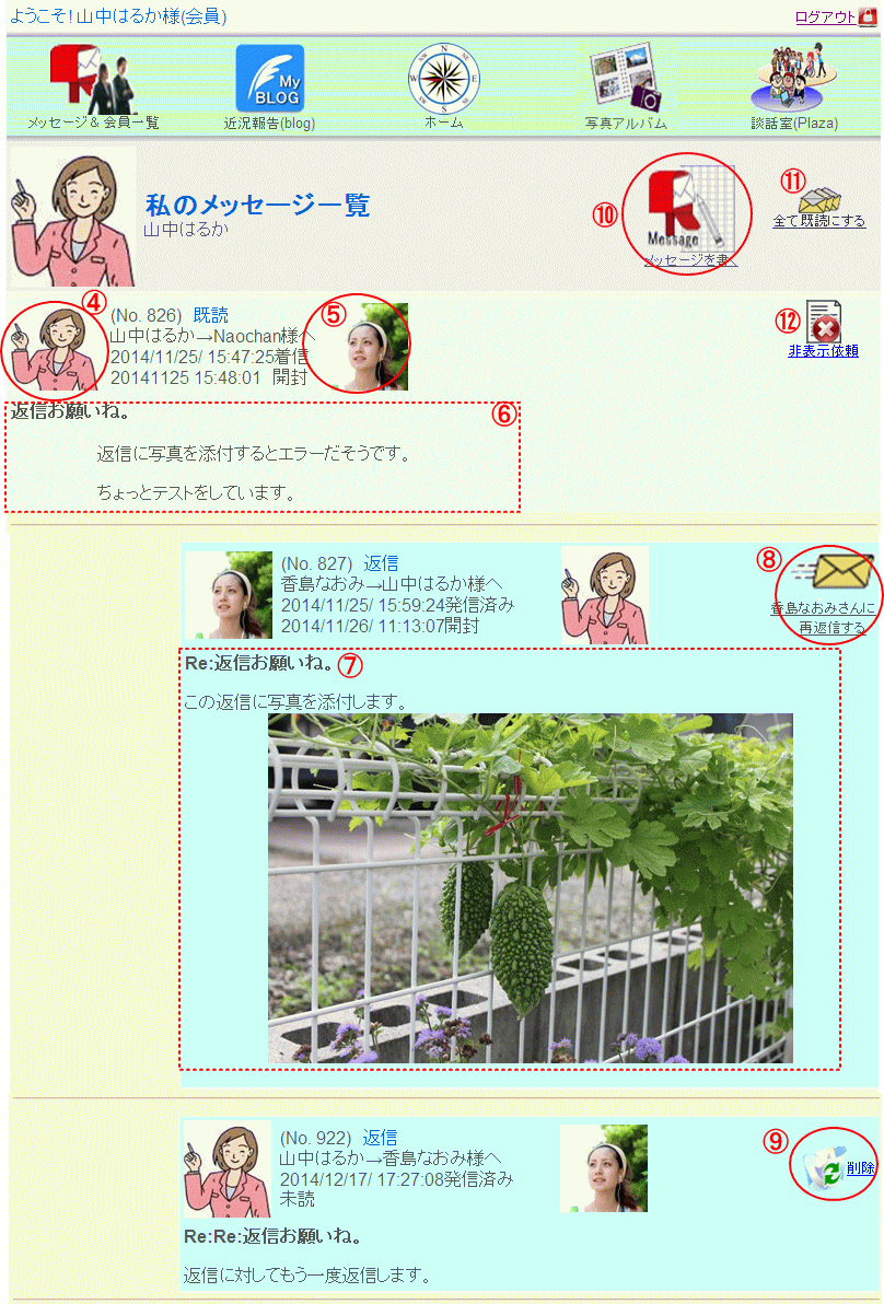 ●メッセージの閲覧では送信したメッセージとこれに対する返信が時系列的に