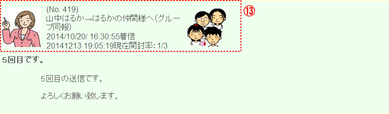 メッセージを宛先グループに送信すると、送信者側の表示はこの様になります。 受信者の個々の内容は「宛先グループ」の構成員を見て下さい。