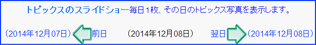 この写真をクリックすると、今日のトピックスの詳細記事が表示されます。 拡大された写真の上部に日付と矢印が表示されているので前日・翌日で過去の日付のトピックスを見ることが出来ます。